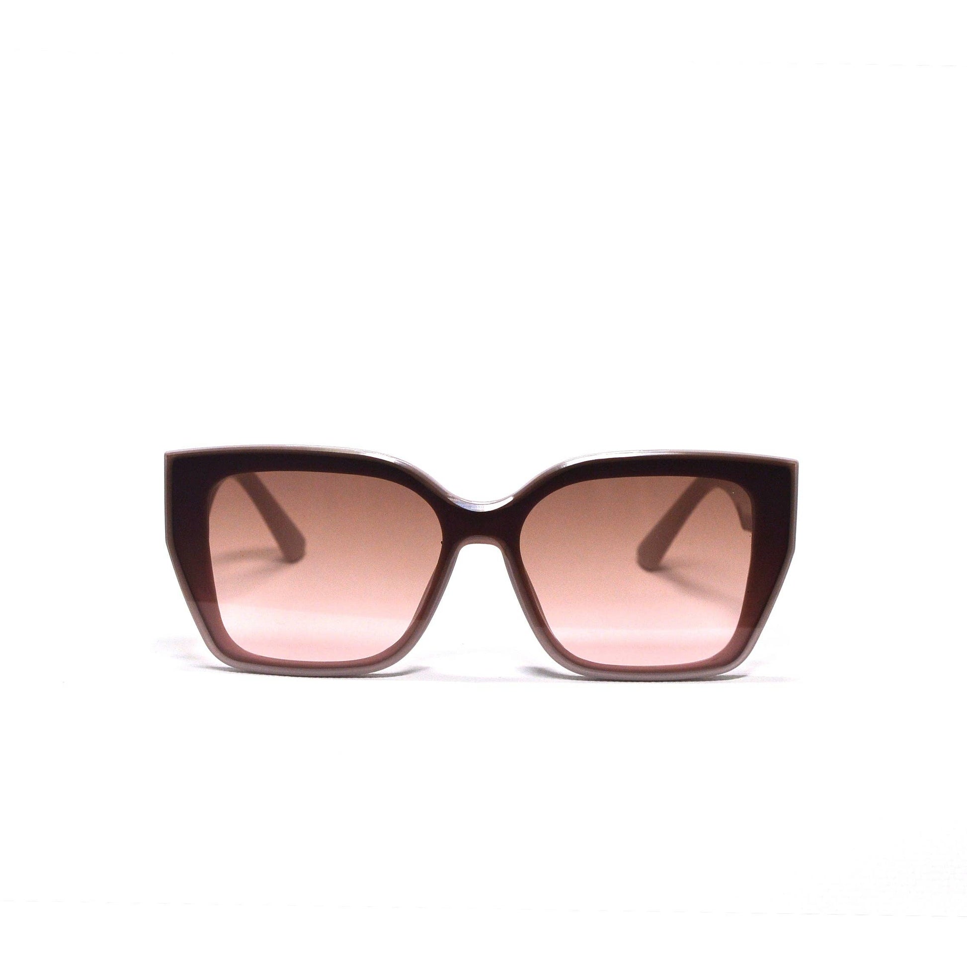 Sunglasses with gold emblem. Gray and rose pink lenses.