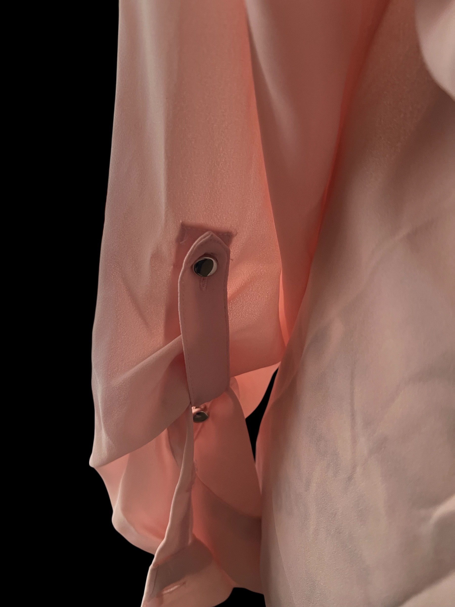 This baby pink button-down top from New York & Company features delicate ruffles and elegant silver buttons, adding a refined touch to your wardrobe. Crafted from 100% polyester, it offers a smooth, lightweight feel ideal for both casual and professional settings. Available in a medium size, this gently-used piece combines feminine details with versatile wearability.