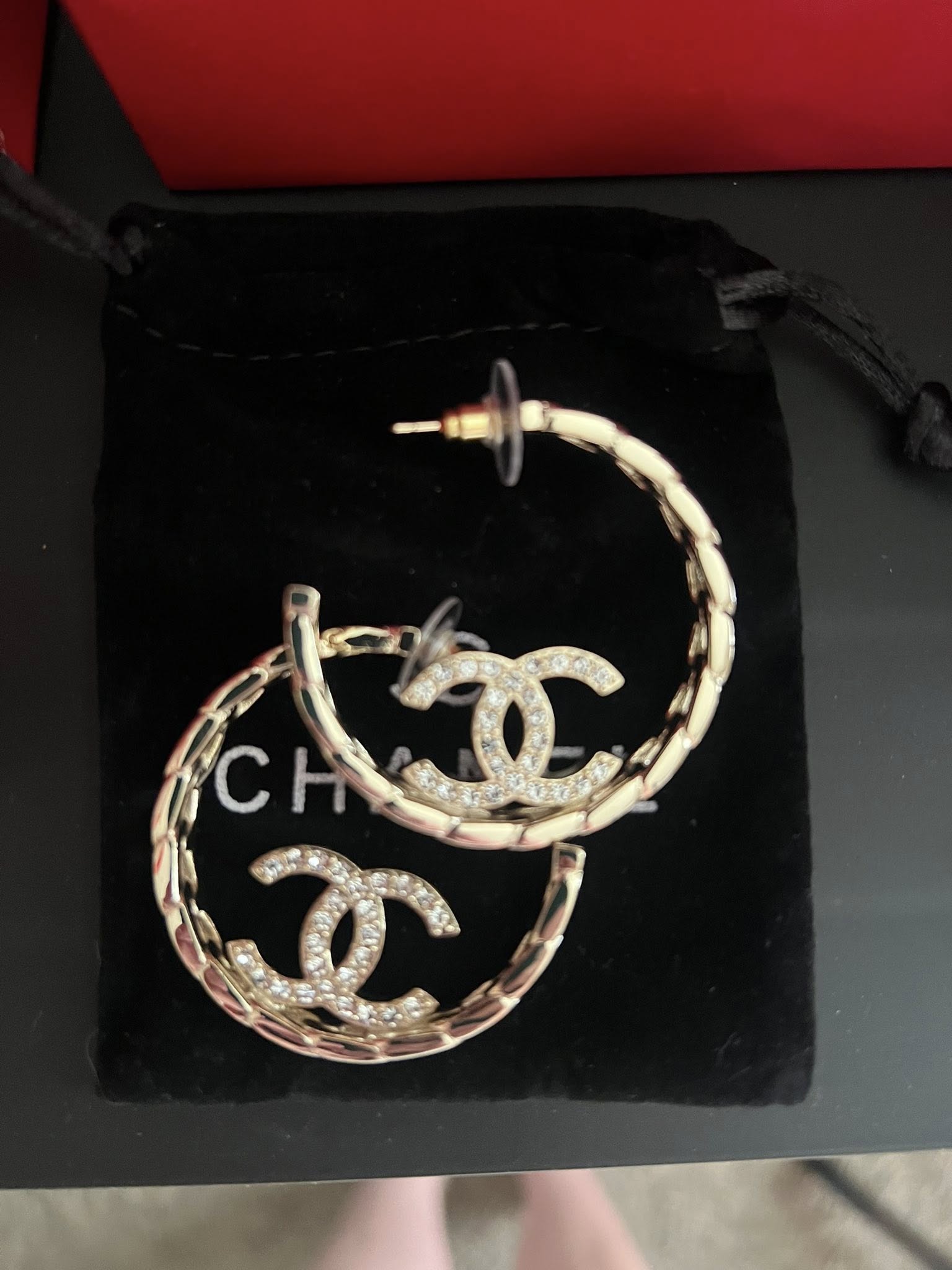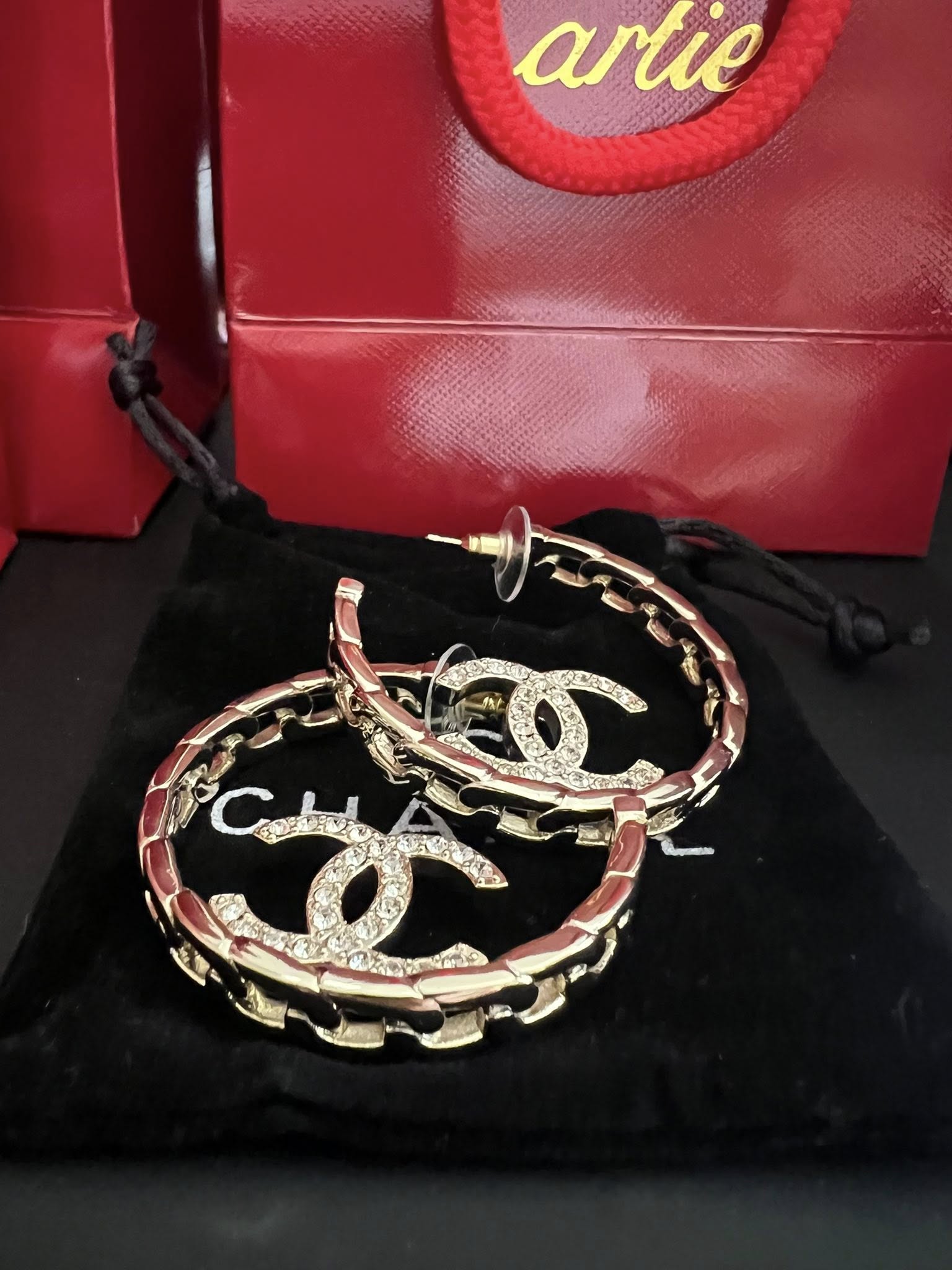 Turn heads with these stunning gold-tone hoop earrings featuring a bold woven-style design and sparkling crystal embellishments. The iconic double-C inspired detail adds a chic statement, making them perfect for both casual and dressy looks. Lightweight yet eye-catching, these hoops are a must-have for your jewelry collection!