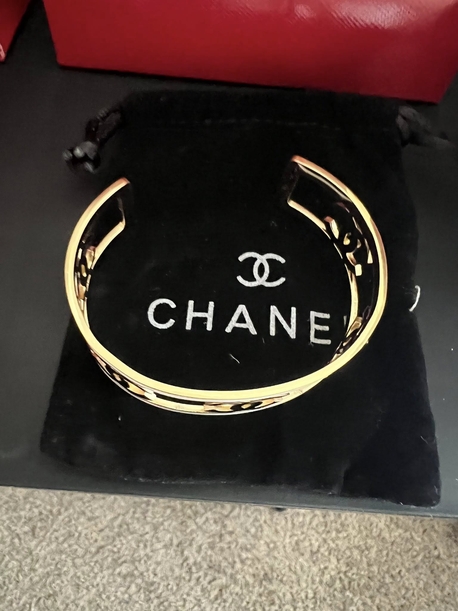 Elevate your look with this bold gold-tone cuff bracelet featuring cutout detailing and sleek double-C inspired accents. Chic, modern, and eye-catching—this piece is perfect for stacking with other bangles or wearing solo for a luxe statement. A must-have accessory for every fashion lover!