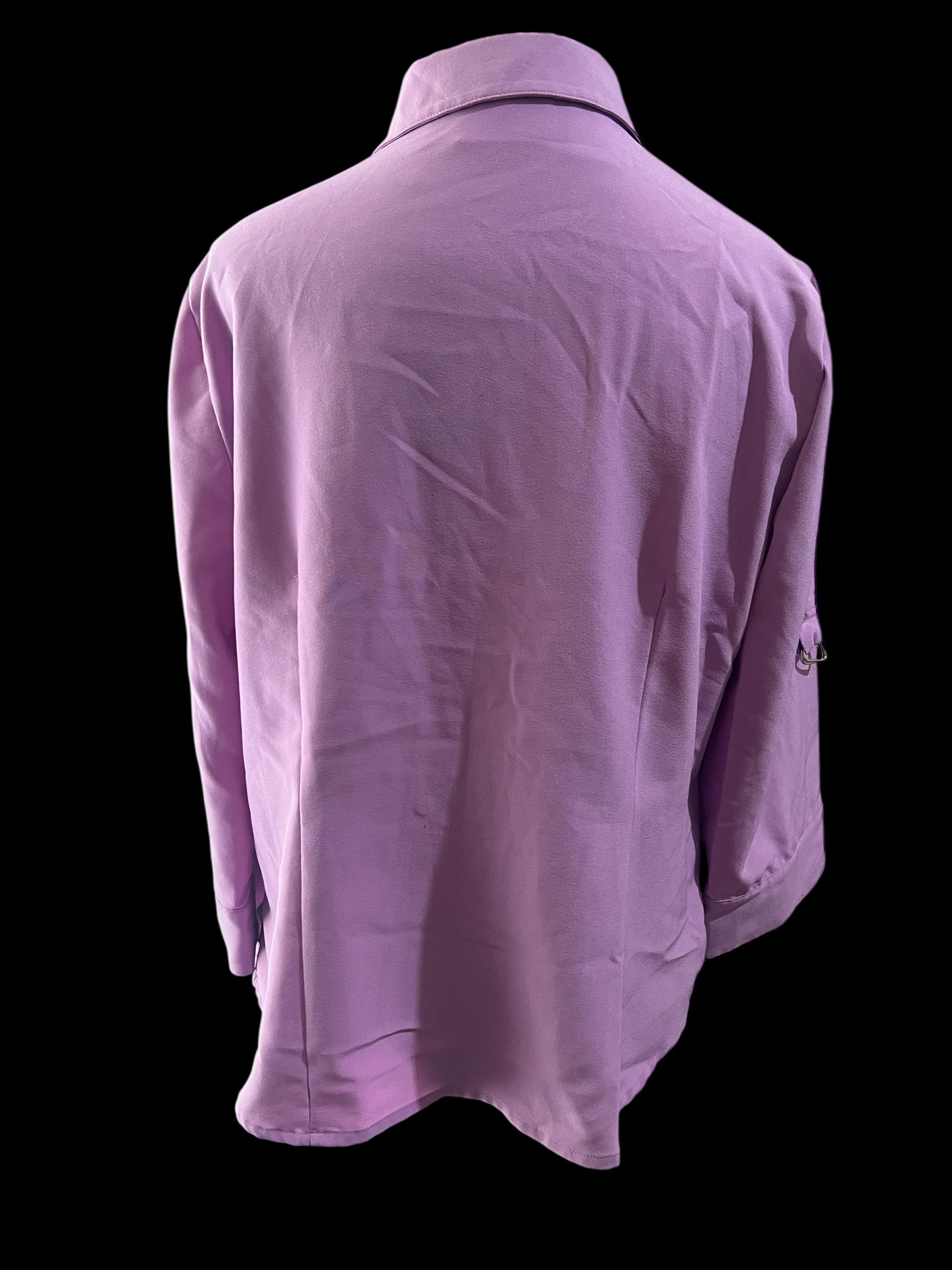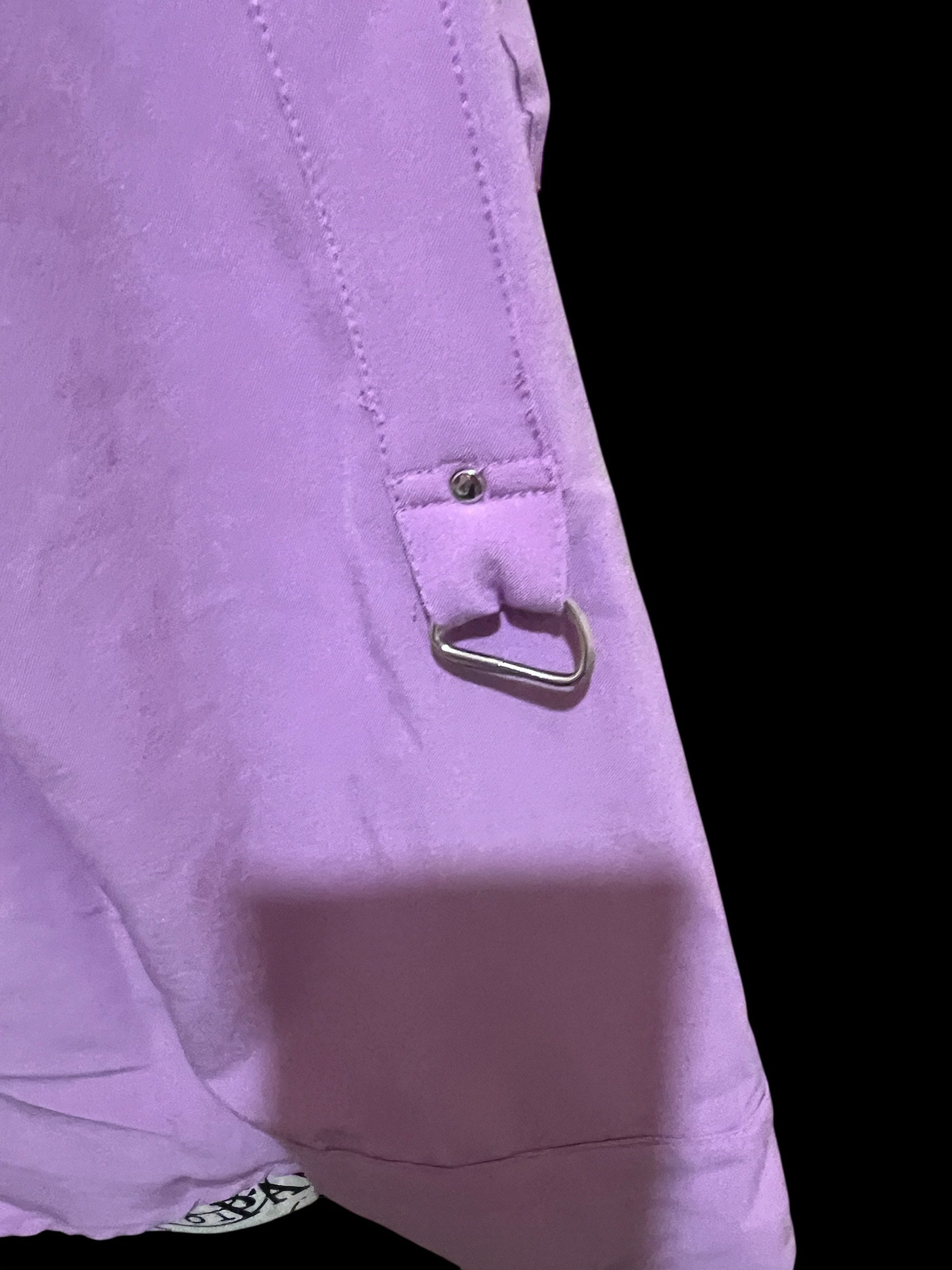 This gently used ladies’ button-down shirt in a rich purple hue features stylish silver grommet detailing for a modern edge. Crafted from a comfortable blend of 94% polyester and 6% spandex, it offers a flattering fit and slight stretch. Sized medium, brand Kathy Che, it combines durability with subtle sophistication, making it a versatile addition to your wardrobe.