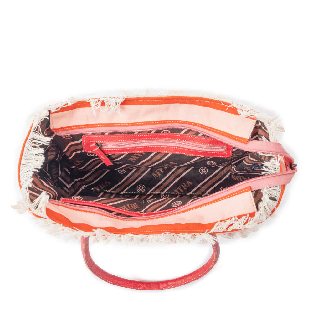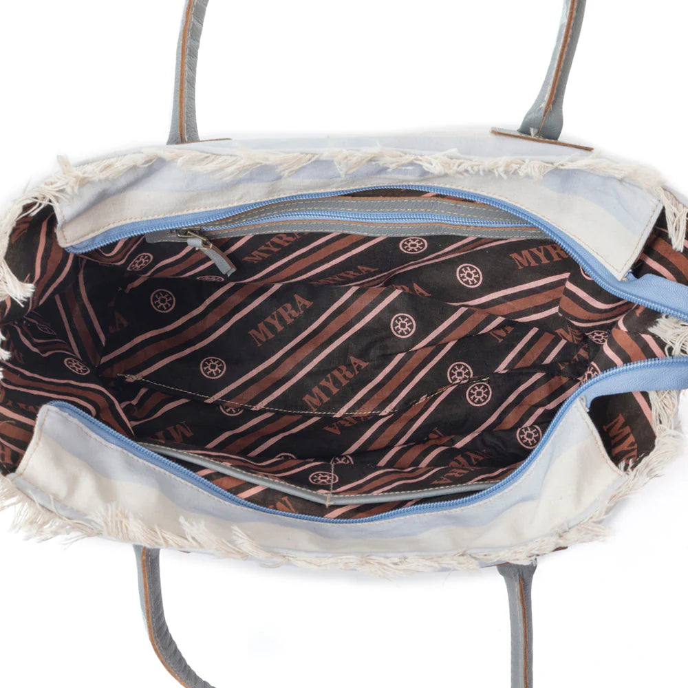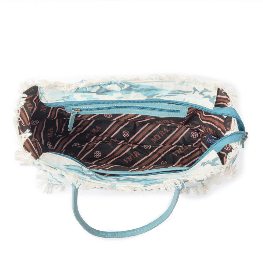 An accessory with a wonderfully serene theme! Drift into summer with our beach-ready tote in calming waves of sky blue and sandy cream upcycled canvas. Featuring artisanal frayed edges and weathered leather handles, this laid-back luxury piece captures the essence of coastal living. Perfect for lazy days by the shore or boardwalk adventures. There's plenty of room to carry your belongings, from clothes to groceries to travel essentials. Zipper-close top with durable carrying handles in chocolate leather.